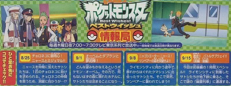 V ohlášeném jednohodinovém speciálu rozděleném na dvě části, který má být odvysílán v září, debutují šéfové Battle Subway Kudari a Nobori (Emmet a Ingo). Krátká anotace naznačuje, že Satoshi a spol. při návštěvě metra v Raimon City (Nimbasa) narazí na tajmený ‚ghost train‘.